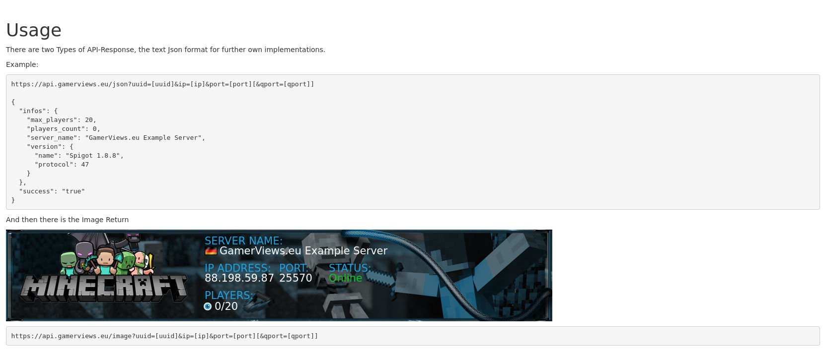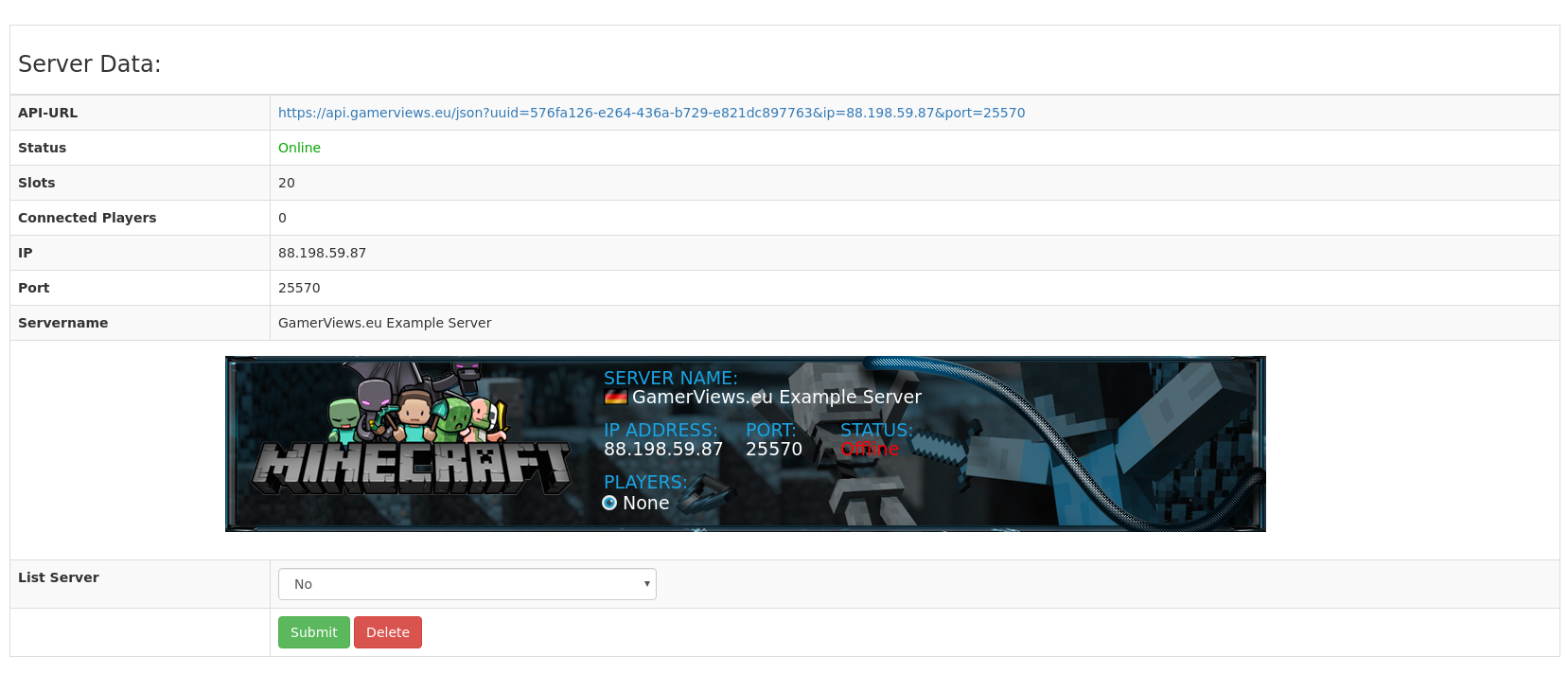 in diesem Thread möchte ich euch einmal mein derzeitiges Projekt vorstellen (Login | GamerViews), welches heute in die Beta geht. Es handelt sich hierbei um eine Webseite in die sich Gameserver eintragen lassen, und diese als Bilder, oder auch als API ausgeben lassen. Die Api funktioniert im derzeitigem Status leider nur wenn der Server auch wirklich online ist, da die Daten derzeit noch live abgefragt werden.