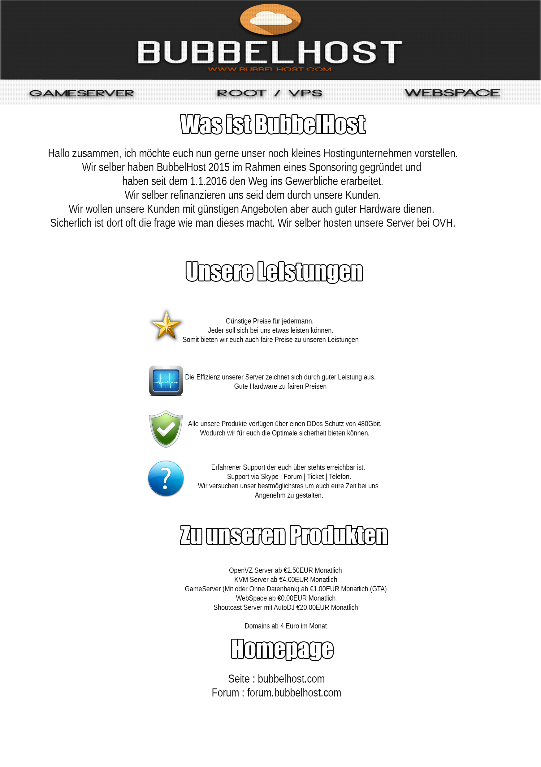 Wir wollten BubbelHost ein Aussehen verpassen, was ansehnlicher und individueller ist. Wir haben versucht, alle Fehler zu beheben, sollten uns noch welche entgangen sein, bitten wir, uns diese mitzuteilen (am besten per E-Mail)//Update 2