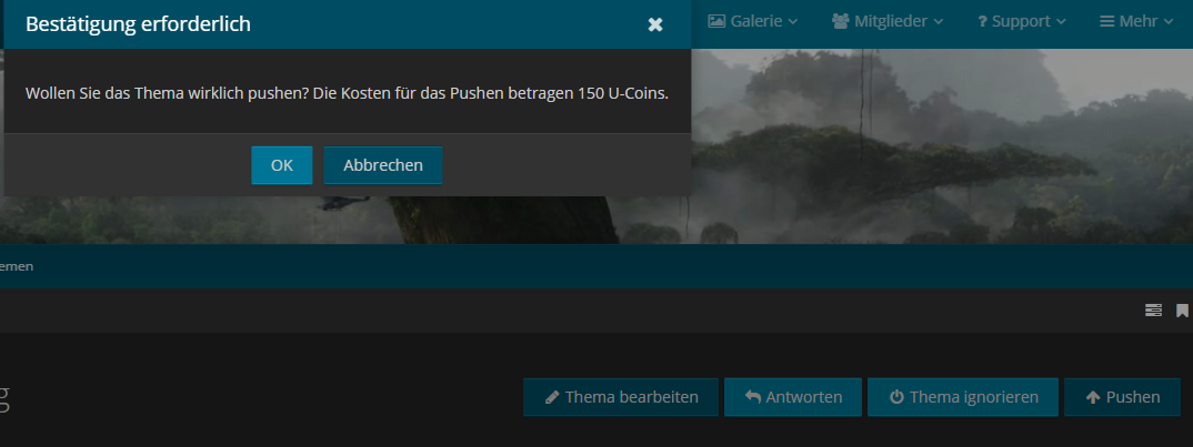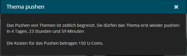 - Um ein Thema hervorzuheben, hat der Themenersteller die Möglichkeit, dies über einen Push-Button direkt in seinem Thema zu tun. Dies ist alle 7 Tage (für Premium alle 5 Tage) nach der letzten Antwort im Thema gestattet und kostet 150 U-Coins. (24-Stunden Sperrung)