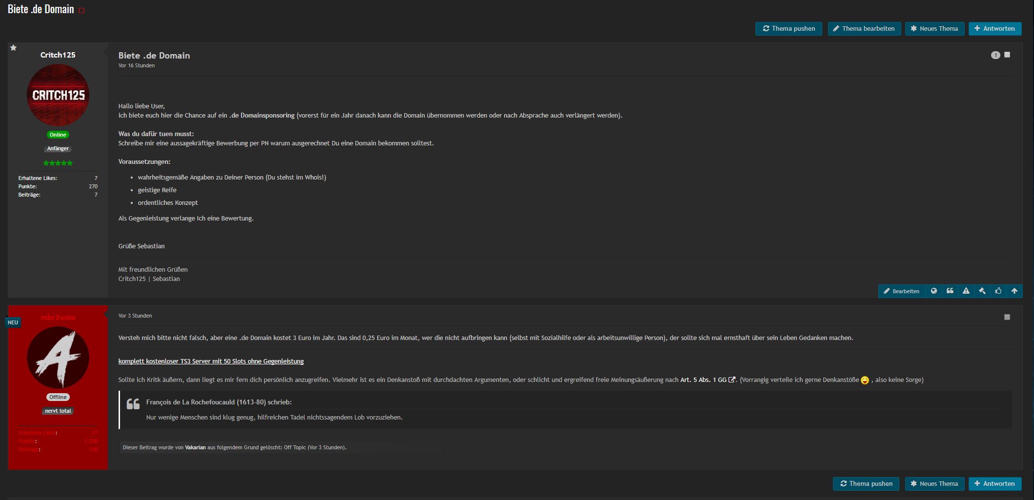 Ich schreibe zwar nichts unter "schlechte" Anfragen ich lese diese still und denke mir meinen teil. Ich lese auch die selben Anfragen in anderen Foren und verfolge diese dort auch genau so wie hier, finde ich jetzt einen der überall nur wegkommentiert schicke ich ne Mail mit einem Angebot und einer Probezeit an diesen. Und tja was soll ich sagen, die meisten bestehen die Probezeit und man hält gerne den Kontakt. Klar es gibt ausnahmen aber die bekommen dann ne first bis wann sie ihre Daten von den Servern runterzuladen haben und dann wiedersehen.