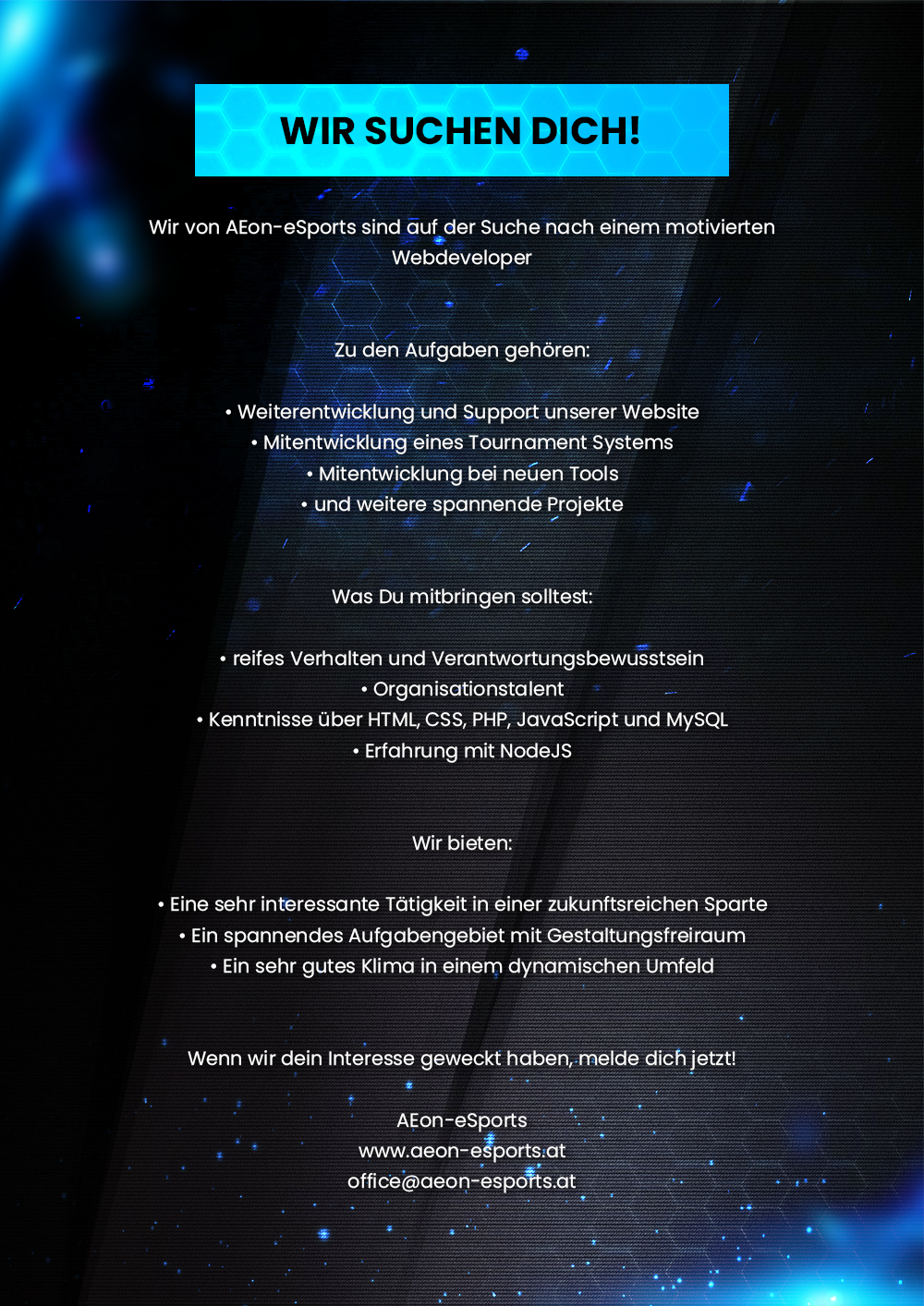 Am 02.01.2018, mit Absprache meines neuen Teams, beschlossen wir das Projekt AEon-eSports wieder mit Freude und vollem Elan neu zu starten. Dieses Projekt wurde für Österreichische Spieler aufgebaut. Nun, da seit Ende 2017 die ESL auch nach Österreich durchgedrungen ist werden wir, im heimischen Bereich Fuß fassen. Mit dem 21.08.2018 würde aus unserem Clan endlich ein Offizieller eingetragener Verein welcher seinen Sitz in Österreich/Kärnten hat.