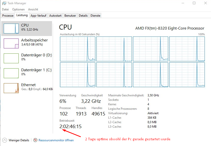 Wie man hier sehen kann ist eine Laufzeit von 2 Tagen 02 Stunden 46 Minuten und 15 Sekunden