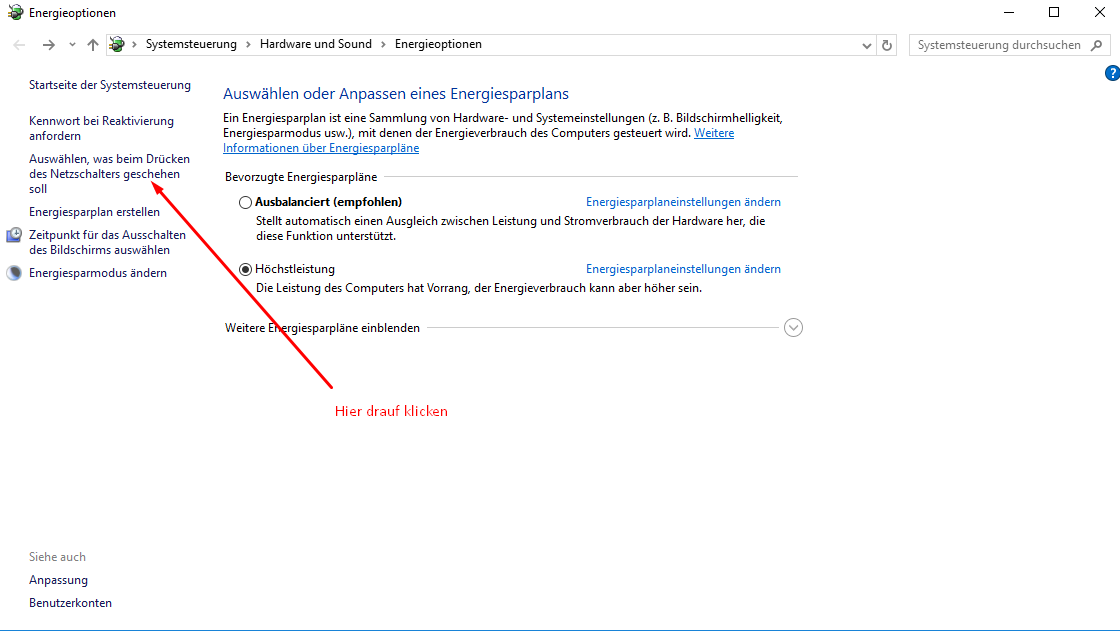 Als erstes geht Ihr über die Systemsteuerung in die Energieoptionen von Windows und befolgt nun diesen Schritt
