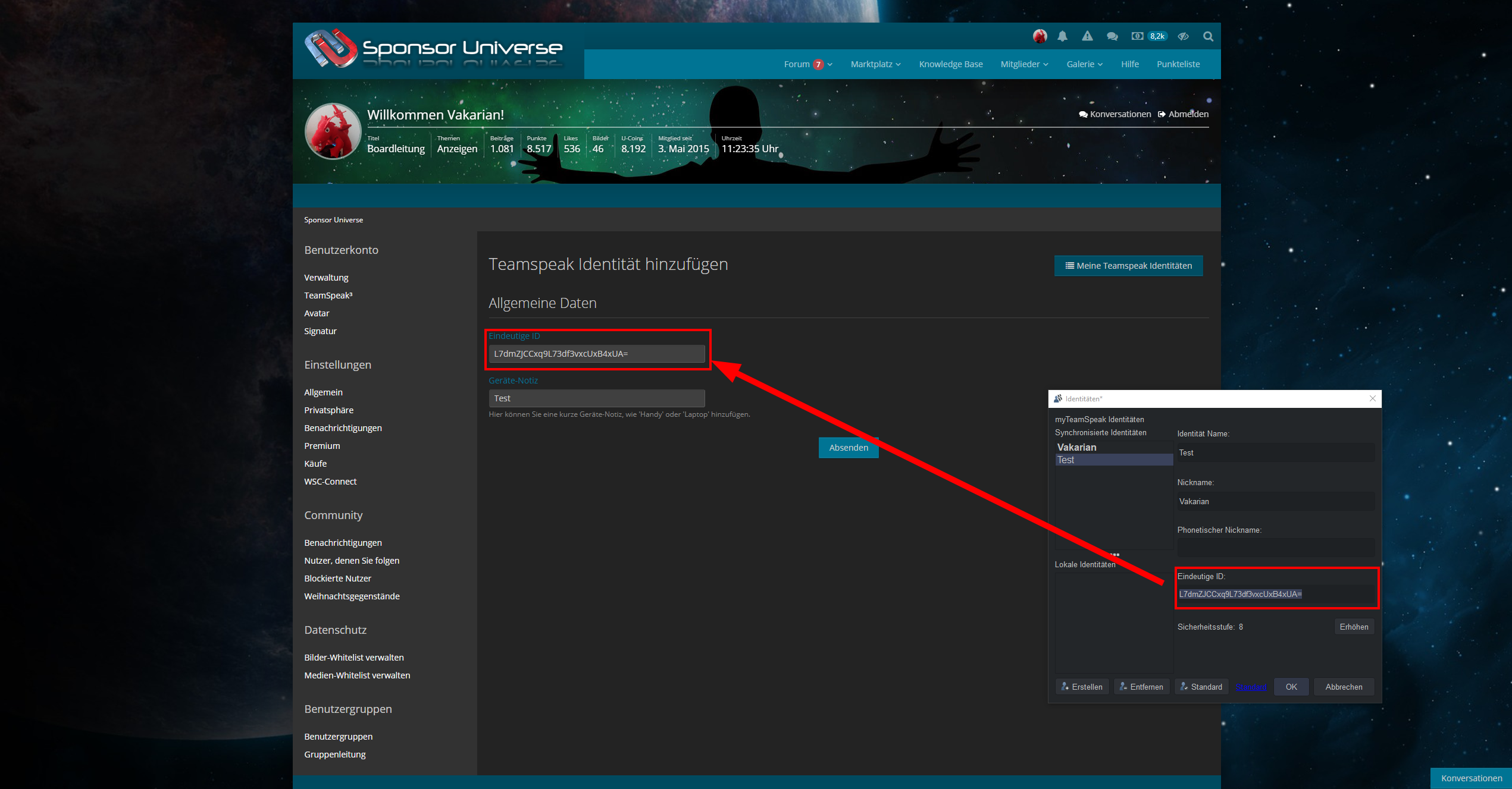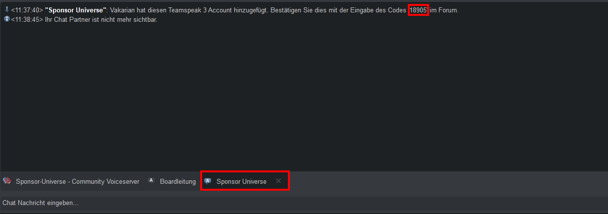 4. Auf dem TeamSpeak³ Server sollte nun eine Private Nachricht von Sponsor Universe mit einem Verifikationscode angekommen sein. Trage diesen Verifikationscode auf der im Schritt 3 genannten Seite ein.